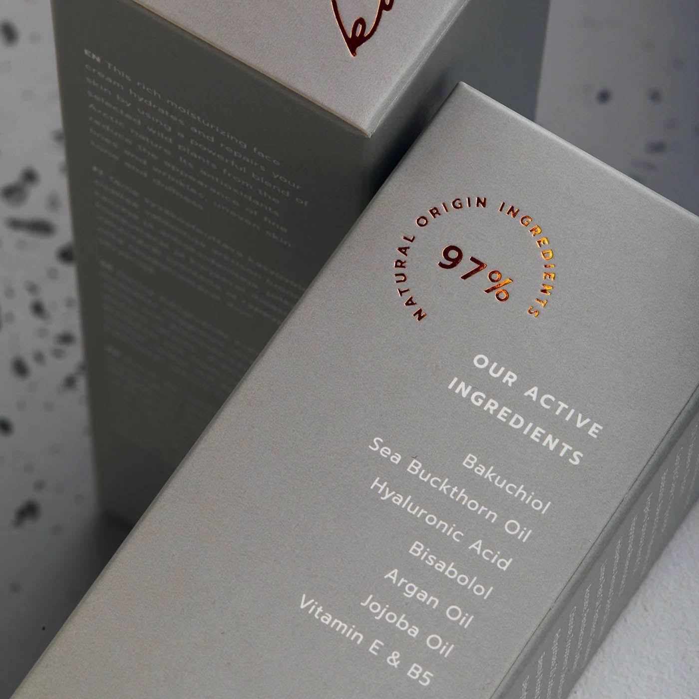 Aqua, Simmondsia Chinensis Seed Oil, Squalane, Glycerin, Caprylic/Capric Triglyceride, Bisabolol, Bakuchiol, Hyaluronic Acid, Argania Spinosa Kernel Oil, Hippophae Rhamnoides Oil, Helianthus Annuus Seed Oil, Citrus Limon Peel Oil, Panthenol, Tocopheryl Acetate, Pantolactone, Sodium Chloride, Tocopherol, Disodium EDTA, Polysorbate 20, Sodium Hydroxide, Benzyl Alcohol, Benzoic Acid, Dehydroacetic Acid, Citral, Limonene