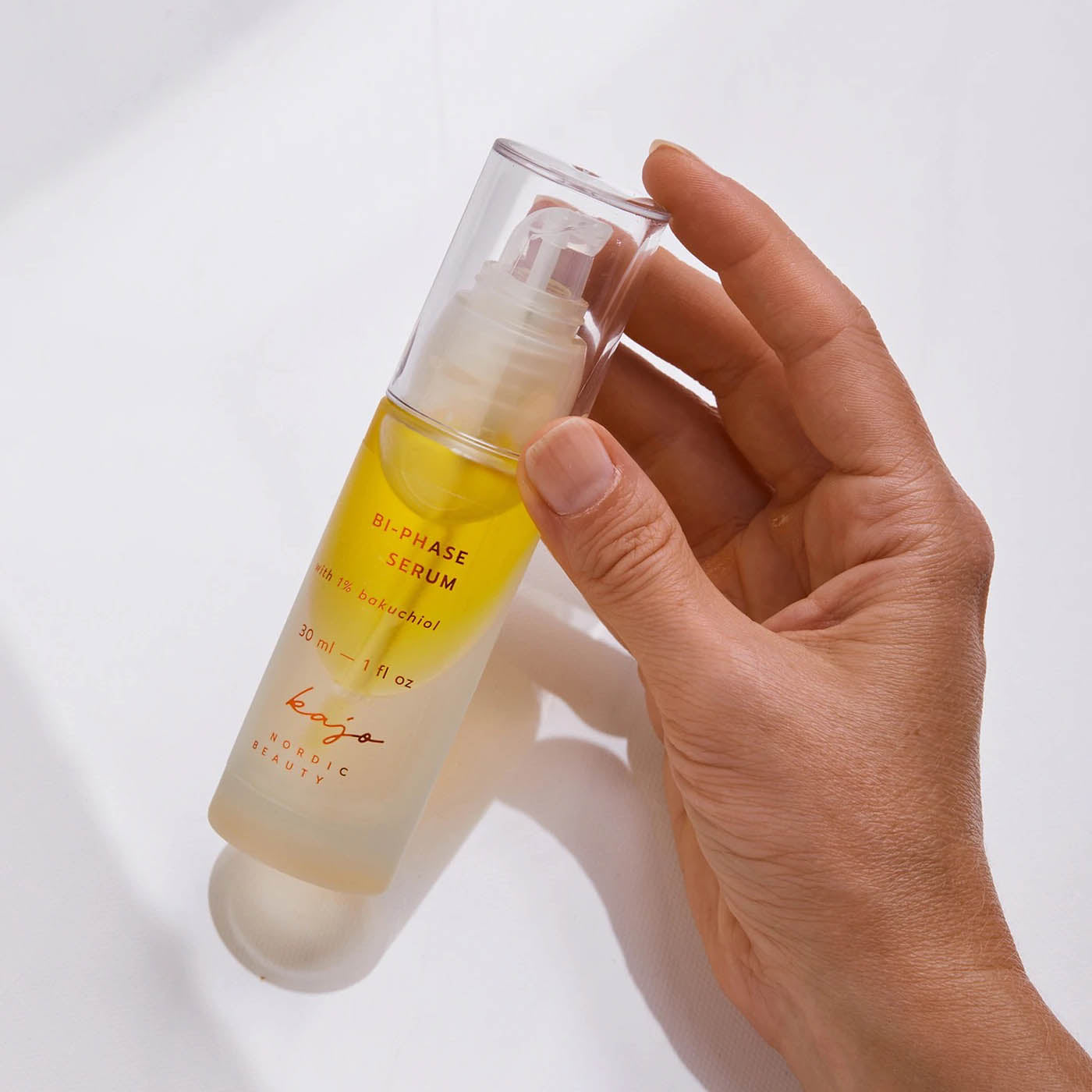 Kaksiosainen seerumi, joka tarjoaa tehokkaan annoksen rasvatonta kosteutusta sekä ravitsevia ja ikääntymisen vaikutuksia estäviä yhdisteitä. Bakuchiol, luonnollinen retinolivaihtoehto, auttaa vähentämään ryppyjen näkyvyyttä ja samalla tasoittamaan näkyvästi ihon sävyä. Erityinen luonnollisten öljyjen ja skvalaanin sekoitus tarjoaa erinomaisen suojan ja auttaa palauttamaan ihon luonnollisen lipiditasapainon. Sillä on voimakkaita antioksidanttisia ominaisuuksia, jotka suojaavat ympäristön stressitekijöiltä. Hyaluronihappo täyttää pinnalliset ja syvemmät kosteussäiliöt ja jättää ihon säteilevän näköiseksi. Bisabololi rauhoittaa ihoa ja vähentää näkyviä ärsytyksen merkkejä. Sopii käytettäväksi aamuin ja illoin. Turvallinen myös raskauden aikana.